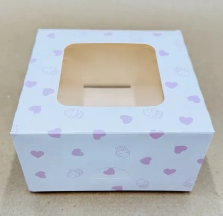 Ühendatud kaanega aknaga kartongist koogikarp.
