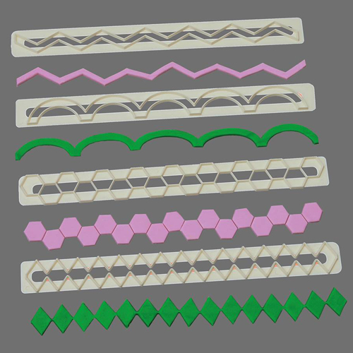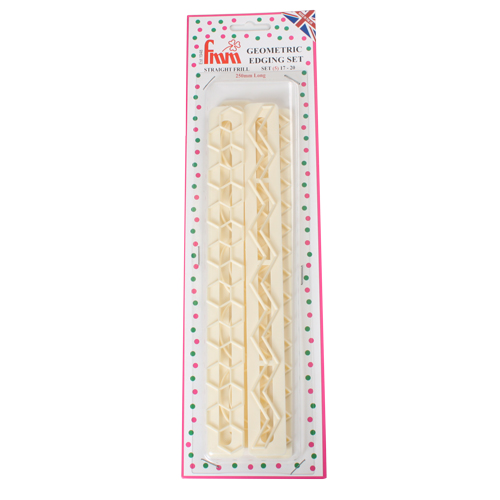 Mõõdud: 24 x 2,5cm. Neli vormi mitmete erinevate võimalustega martsipani- või suhkrumassikattega tordi äärte kaunistamiseks.