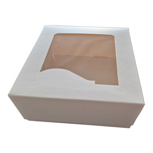 Mõõdud: 18cm x 18cm, h 9,5cm. Ühendatud kaanega valge aknaga koogikarp
